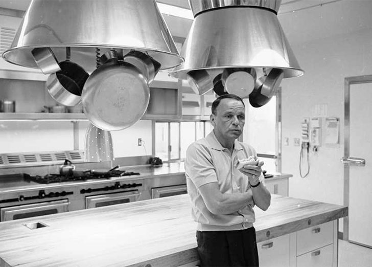Se puede ver a un Sinatra relajado en la cocina de su casa de $100,000 en Palm Springs. Frank Sinatra ha sido honrado varias veces por un ex presidente de los Estados Unidos y ha vendido más de 150 millones de discos en todo el mundo.